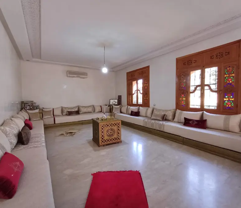 في الطابق العلوي صالة معيشة مغربية كبيرة وصالة معيشة أوروبية وركن مدفأة ومطبخ ومرحاض استقبال مع مغسلتين